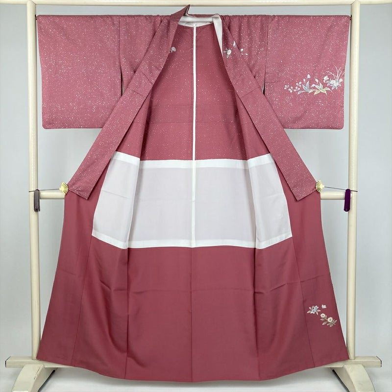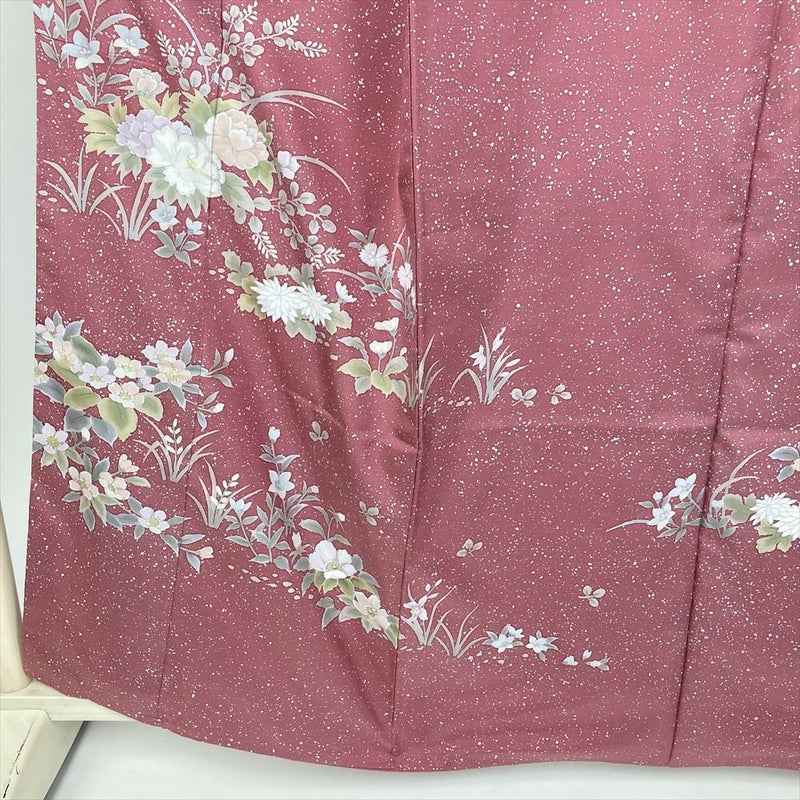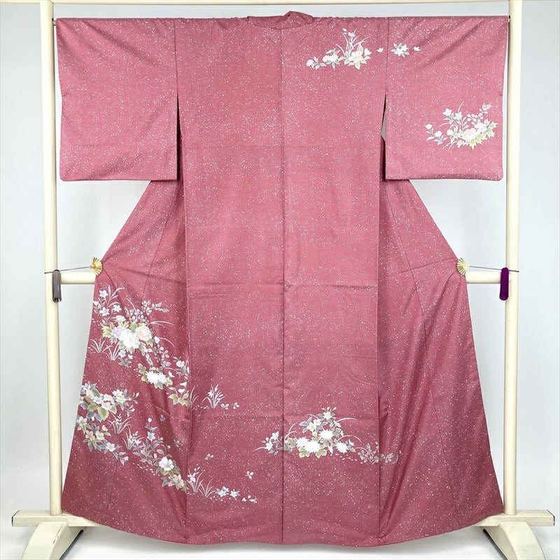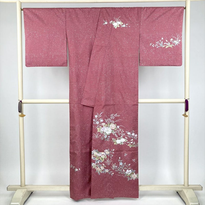 (中古) 訪問着 濃梅 ピンク カジュアル セミフォーマル 蒔糊 四季花 袷 絹【身丈】154cm【裄丈】67.5cm