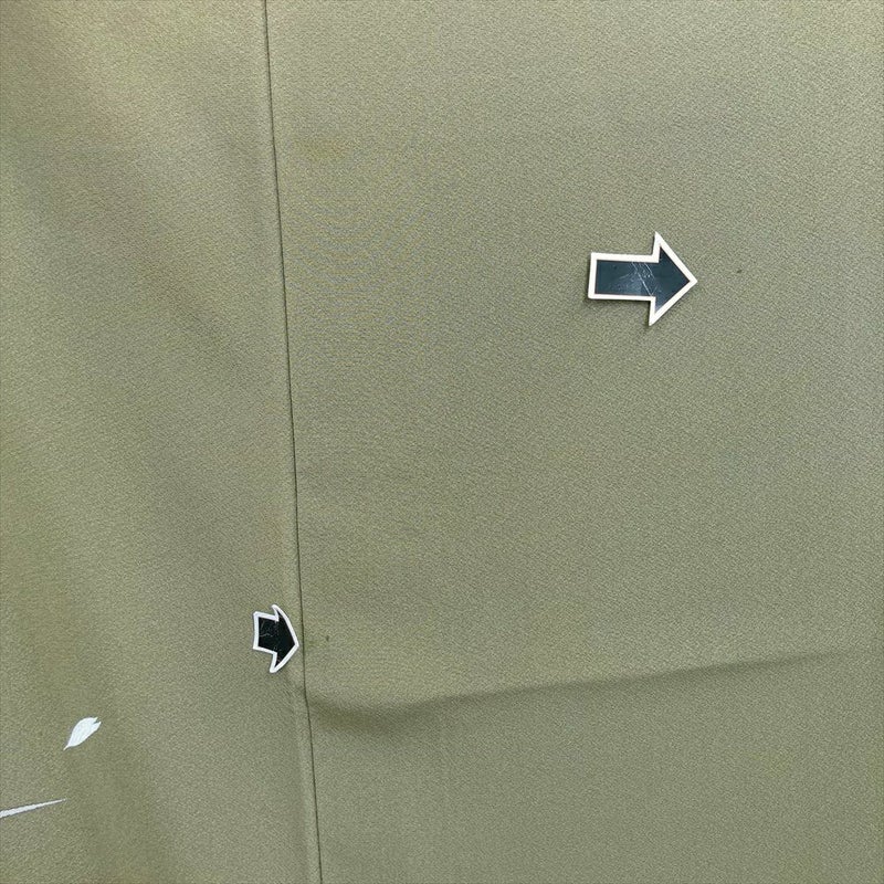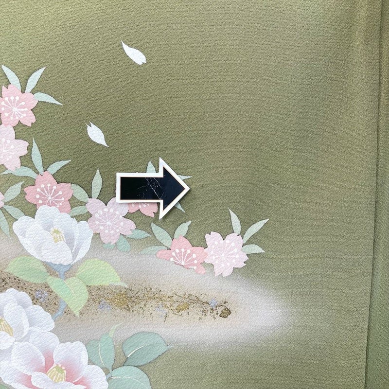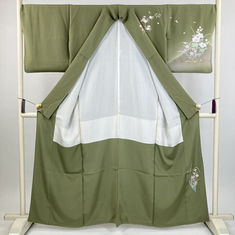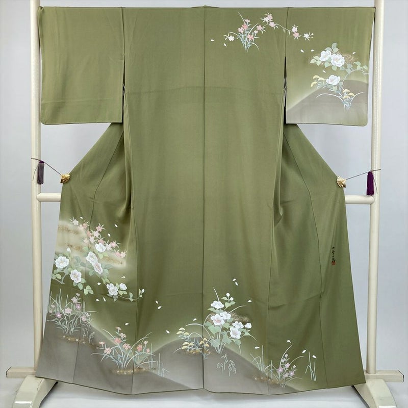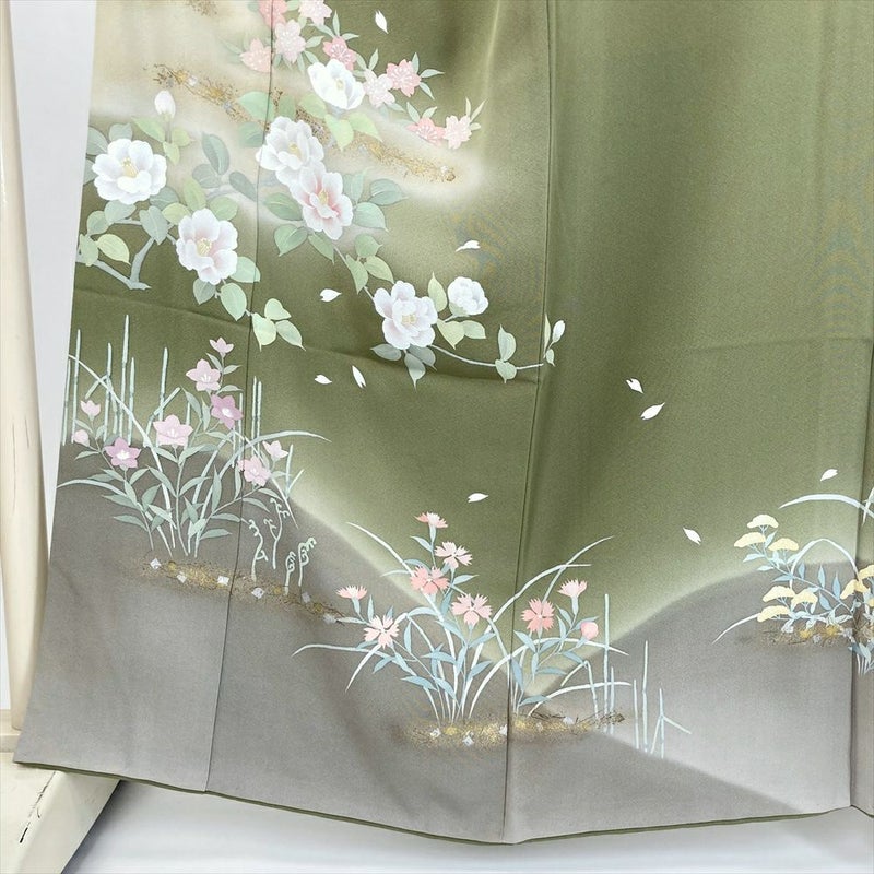(中古) 訪問着 草色 緑 セミフォーマル 椿 桜 撫子 袷 絹 【身丈】156.5cm【裄丈】68.5cm
