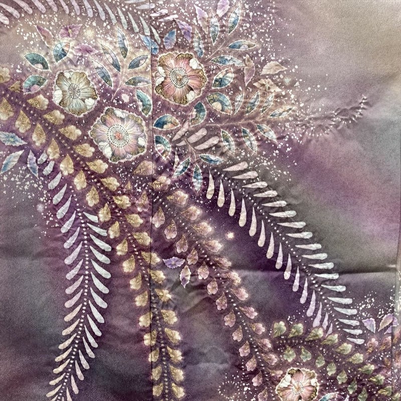 辻が花文様が、ぼかし染め、絞り、金彩によって立体的に描かれています 。