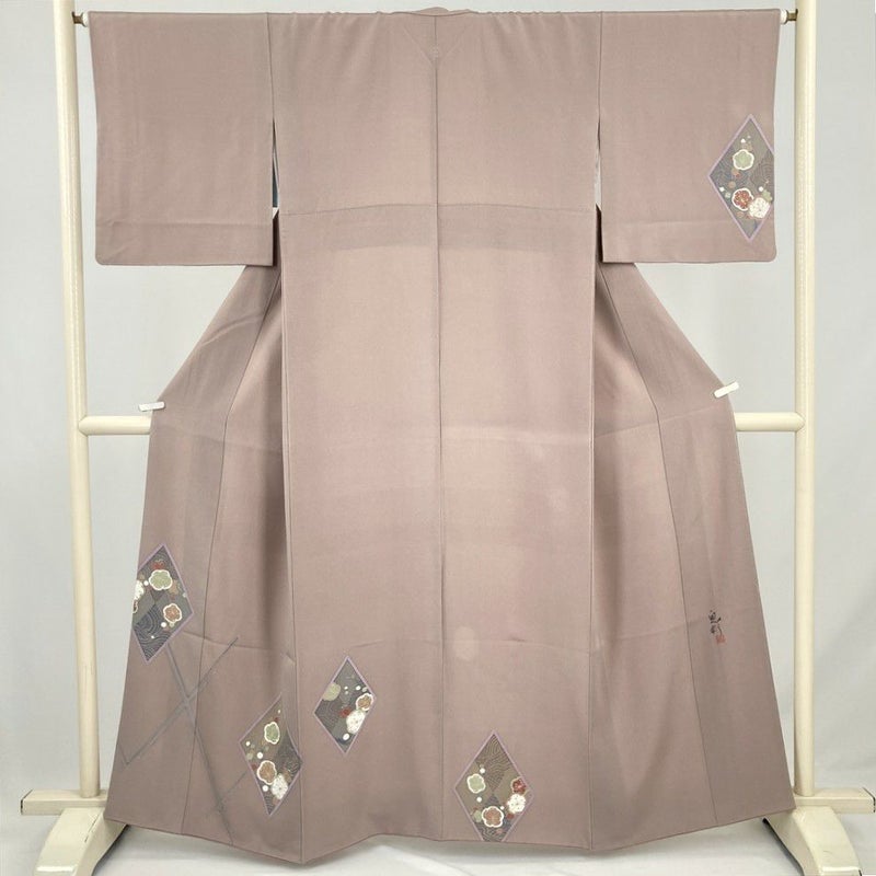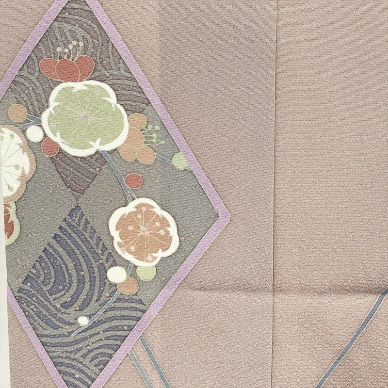 くすみ薄紫地に、菱文と梅の柄が上品に広がる訪問着。