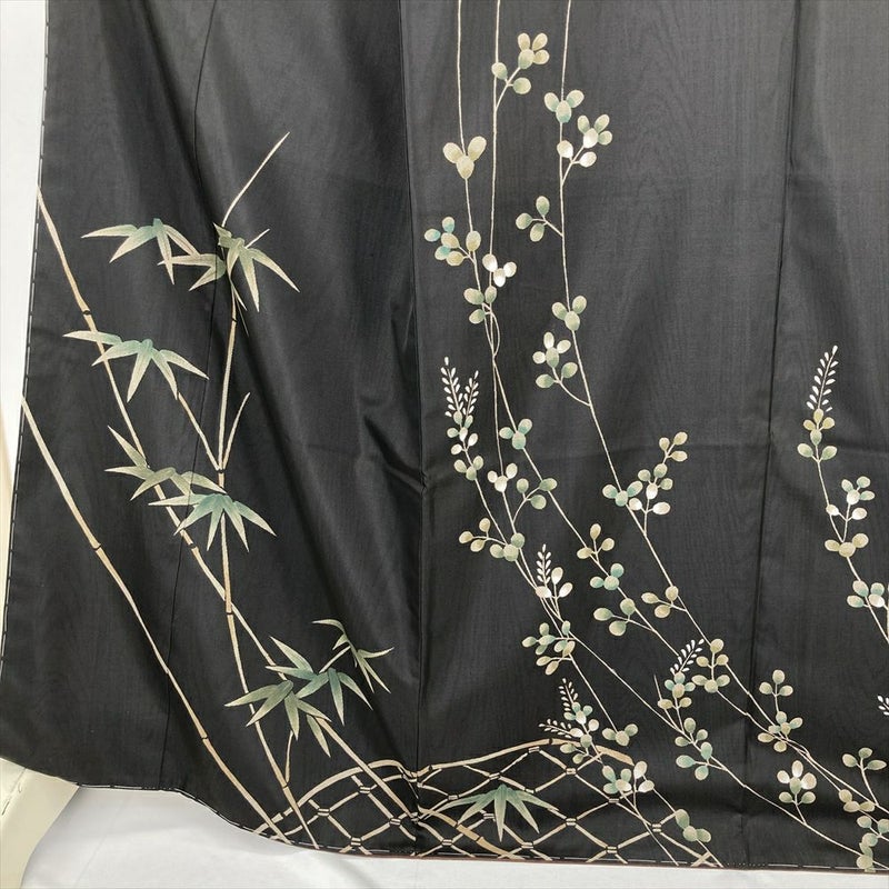 黒地に笹柄が映える、清々しい印象の訪問着。杢目地の風合いが奥行きを添えます。