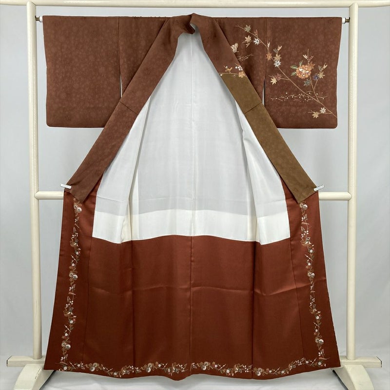 (中古) 訪問着 赤茶 セミフォーマル 垣根 春秋花文 袷 絹 【身丈】153.5cm【裄丈】65.5cm