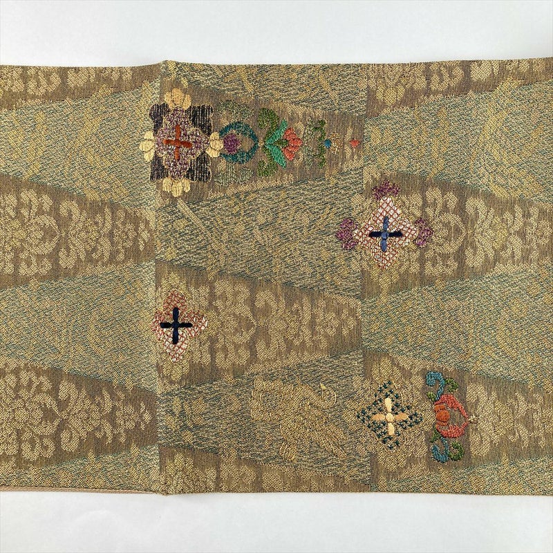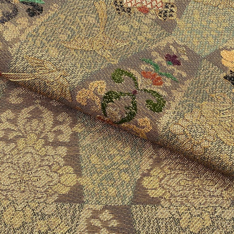金駒刺繍で天平の花鳥を描いた袋帯。