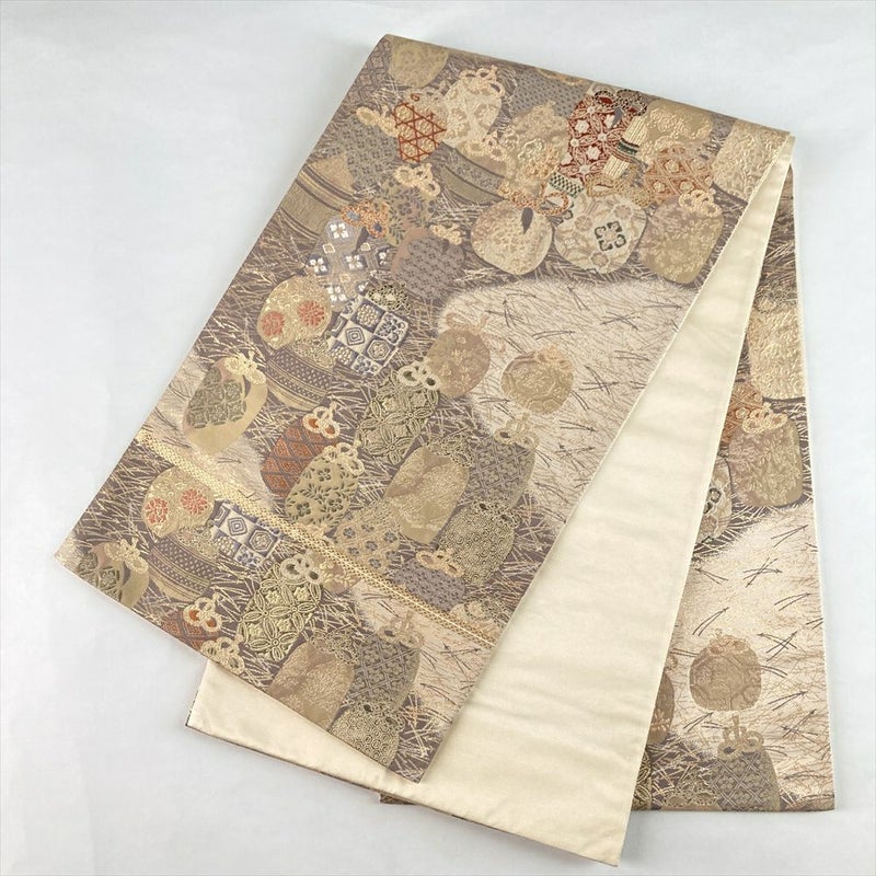 (中古)袋帯 金 グレー セミフォーマル フォーマル 六通 金糸 織り 棗 絹