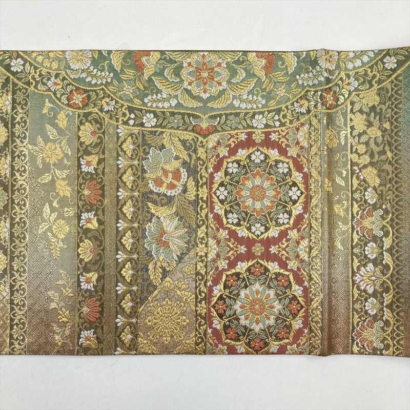 (中古)袋帯 金 緑 フォーマル セミフォーマル 六通 金糸 華文 蔓 花
