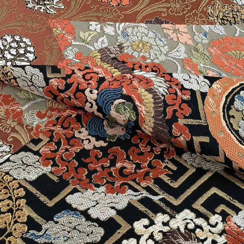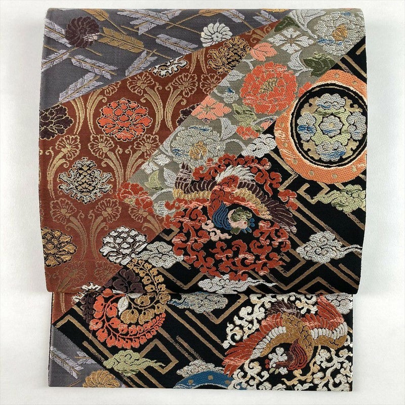 黒地に美しく浮かび上がる裂取文様。その中に優雅に配された鳳凰の丸が、静かな華やかさと気品を添える袋帯です。