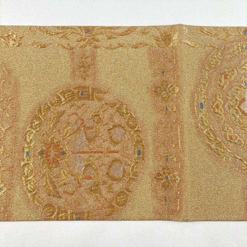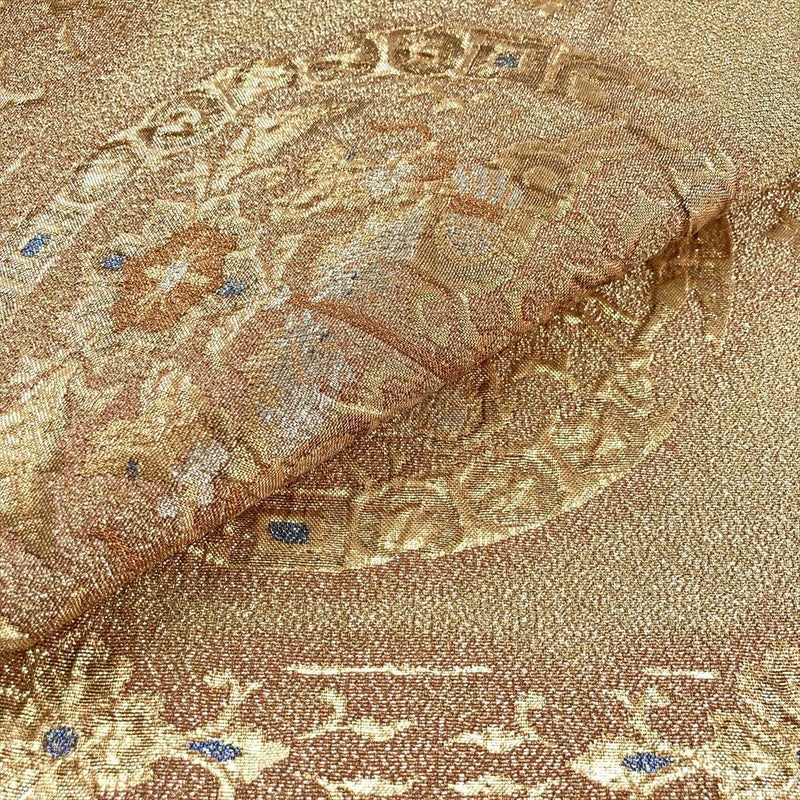 金色の地に施されたふくれ織りが、彫刻のような深い陰影を浮かび上がらせます。