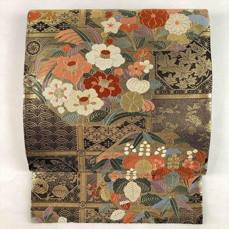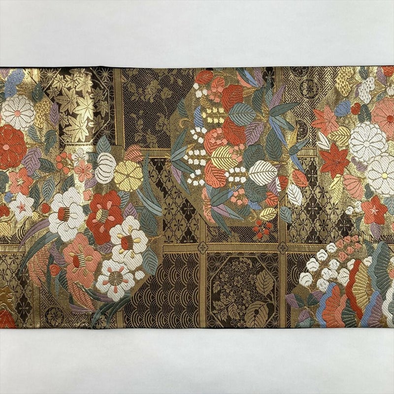 (中古)袋帯 黒 金 セミフォーマル フォーマル 六通 織り 格天井 四季花 絹