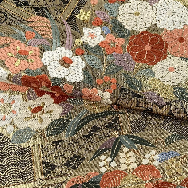 黒地に映える金彩の四季花文が、静かな華やかさを添える袋帯です。
