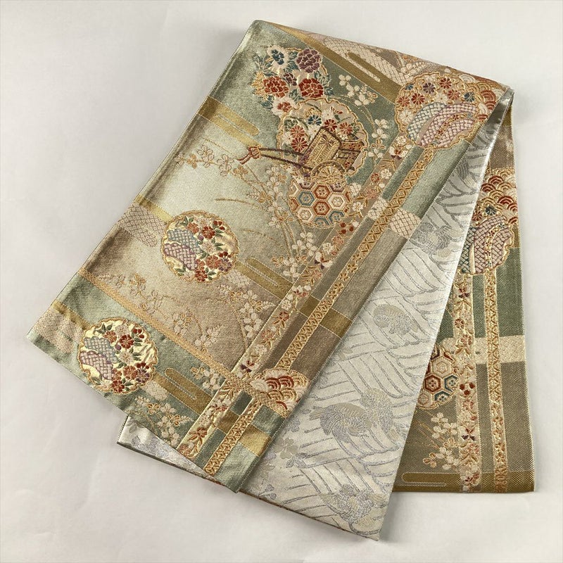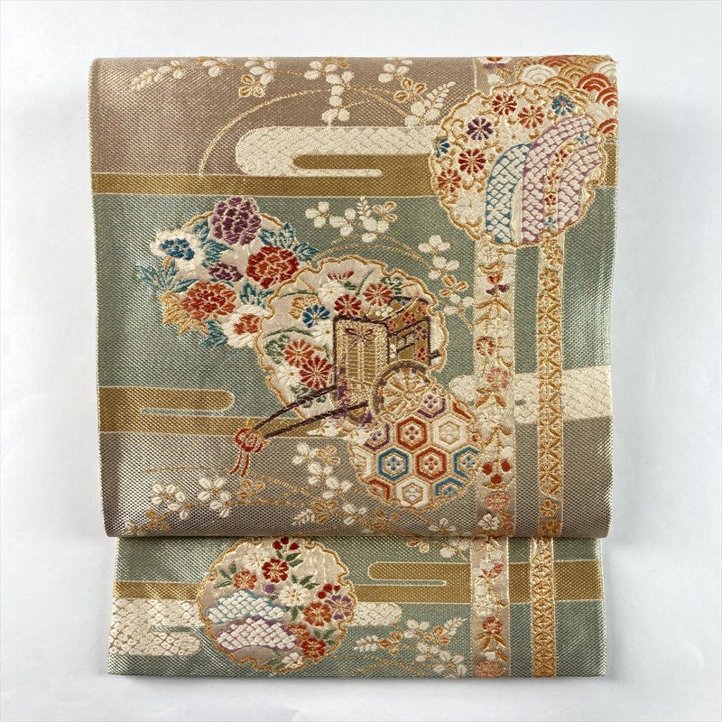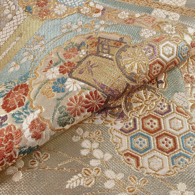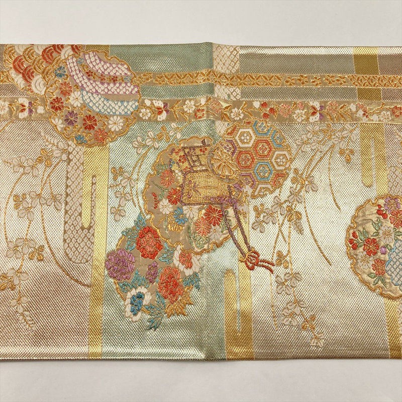 (中古)袋帯 金 セミフォーマル フォーマル 六通 織り 雪輪 ヱ霞 花草 絹