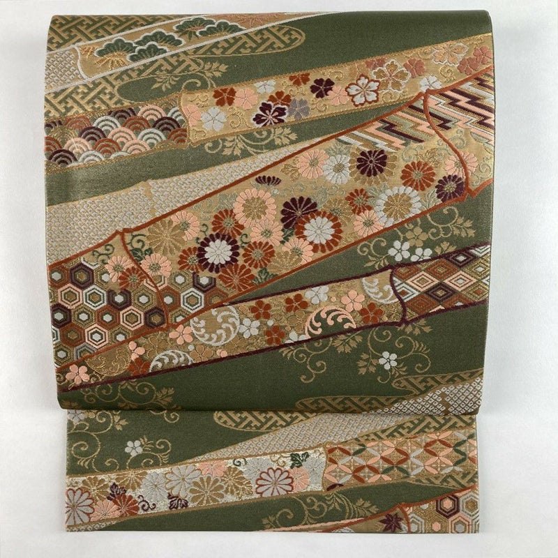 (中古)袋帯 緑 柳茶 セミフォーマル フォーマル 六通 唐織 竹に吉祥文 絹