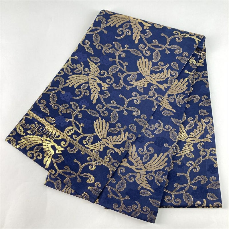 (中古)袋帯 紺 セミフォーマル フォーマル 両面全通 リバーシブル 引き箔 瑞鳥 牡丹唐草 絹