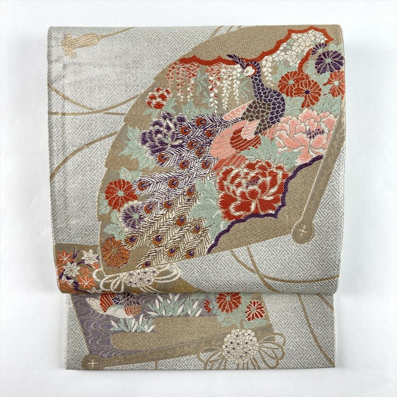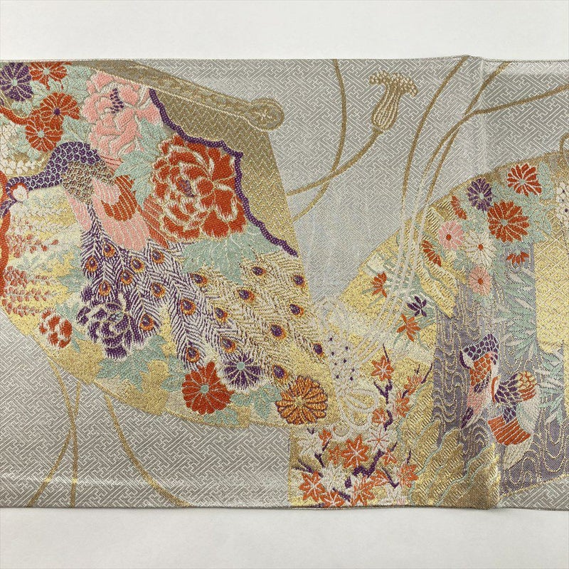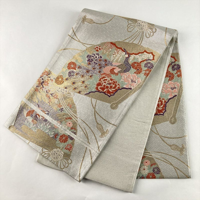 (中古)袋帯 銀 セミフォーマル フォーマル 六通 織り 檜扇 花鳥 絹