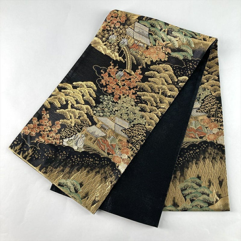 (中古)袋帯 黒 セミフォーマル フォーマル 六通 未仕立て 織り 松竹梅 平安絵巻 絹