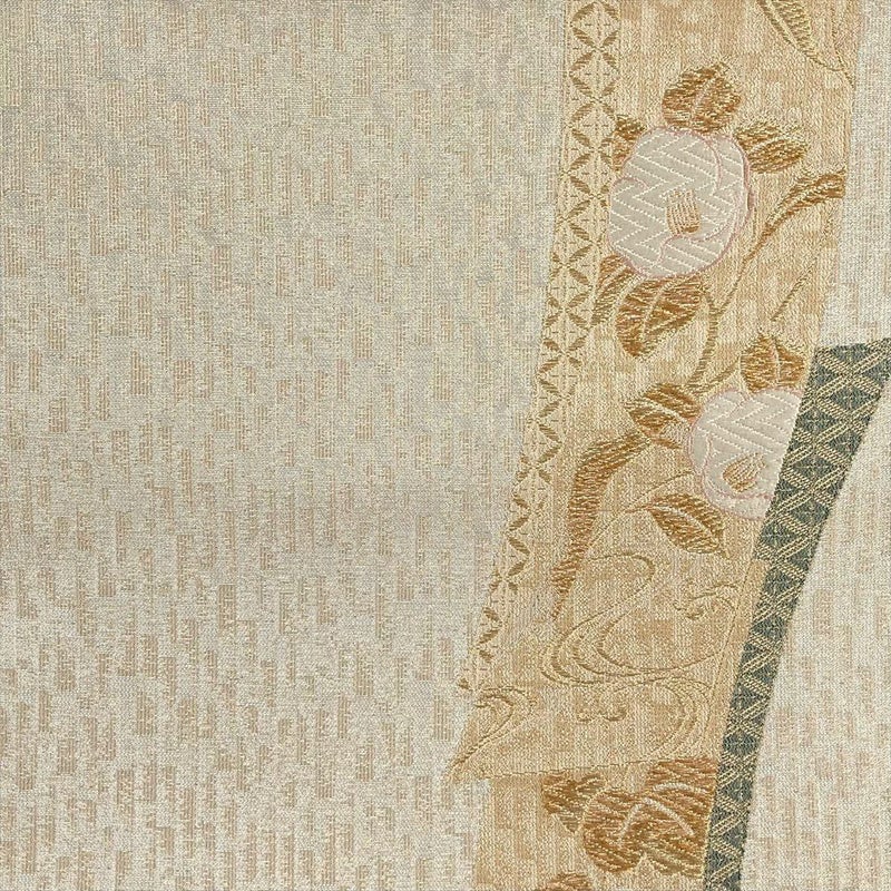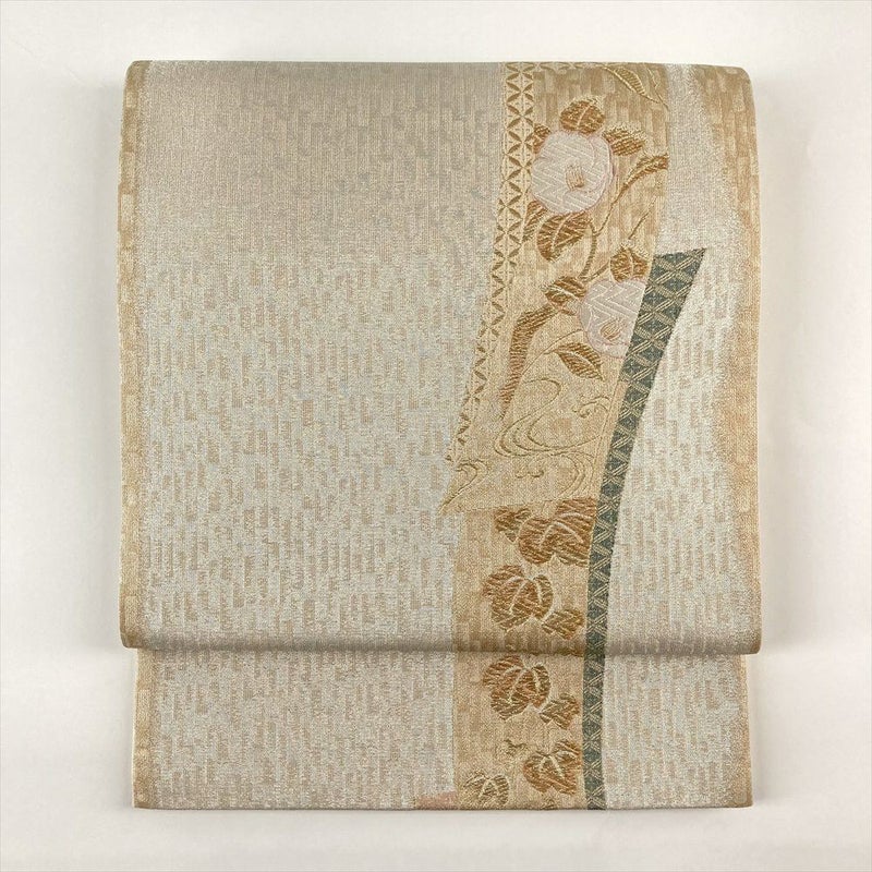 (中古)袋帯 ベージュ フォーマル セミフォーマル 六通 金糸 短冊 椿 蔦 波 七宝 菱 青海波