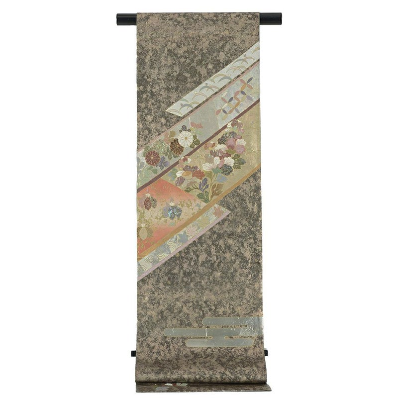 深緑のベースに引き箔を施し、熨斗の中に草花や七宝などを描いた六通の袋帯です。お太鼓柄の左脇にわずかなほつれがあります。着用には支障のない程度です。保存臭も残っています。