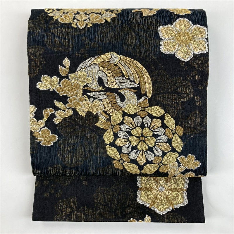 (中古)袋帯 黒 セミフォーマル 六通 すかし織り 金糸 銀糸 華文 向かい鳥 蔓葡萄