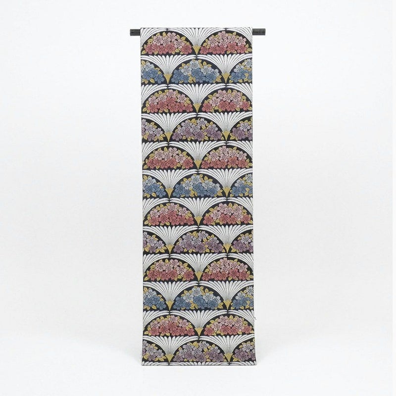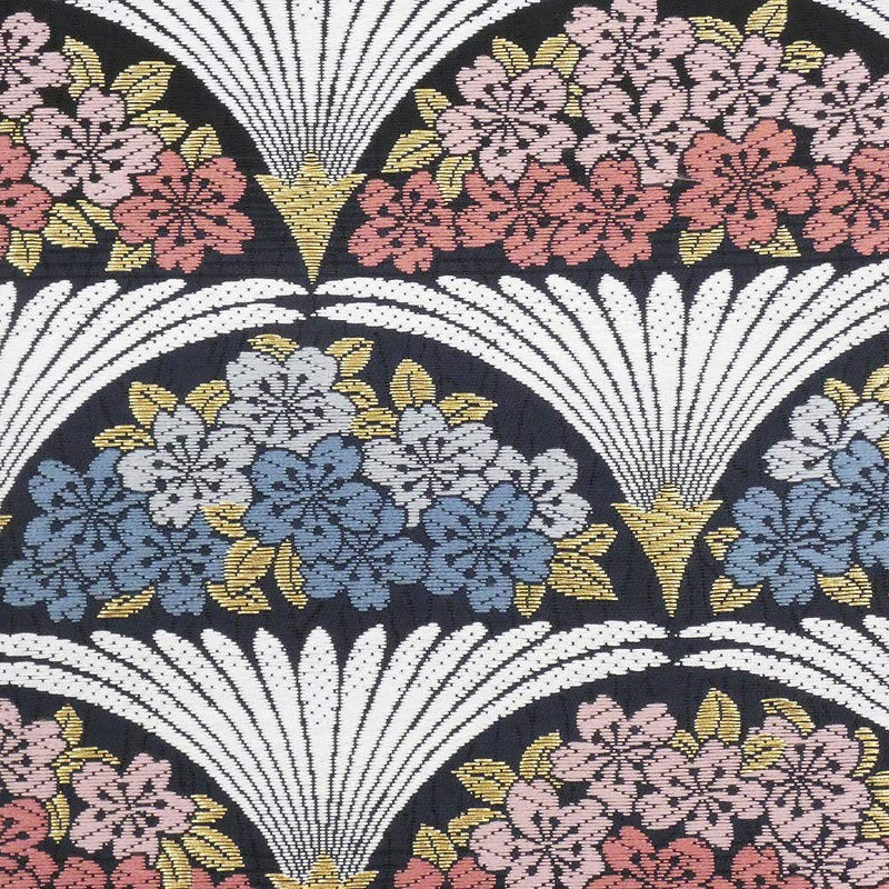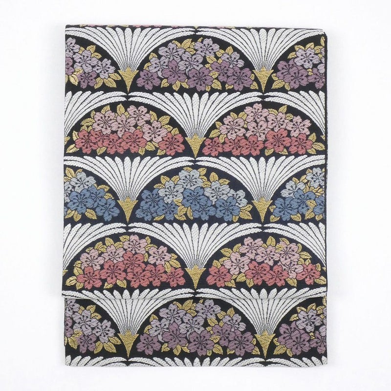 半円の中に桜を織り描いた黒地の袋帯です。青、ピンク、紫の花模様が一列ごとに同色で並んでいま