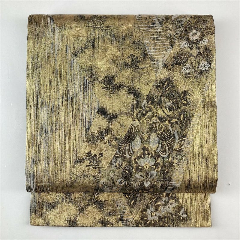 (中古)袋帯 金地 フォーマル 六通 金糸 オーロラ色 鶴 花唐草文 裂取正倉院