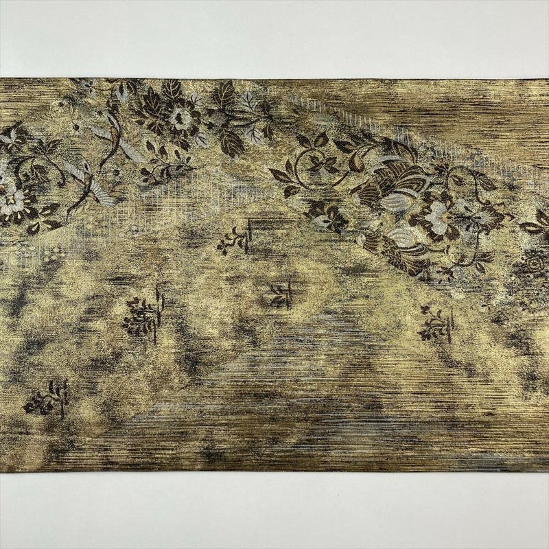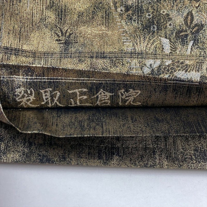 フォーマル・セミフォーマル向きの帯になります。コーディネートするお着物によって表情が変わる上品な帯になります。黒と金でモダンなコーディネートに仕上げられる帯です。たれ先内側に裂取正倉院と縫い取りあり。お太鼓のやまに締めじわ、手先に折りじわが見られますが、着用には問題のない程度と考えられます。
