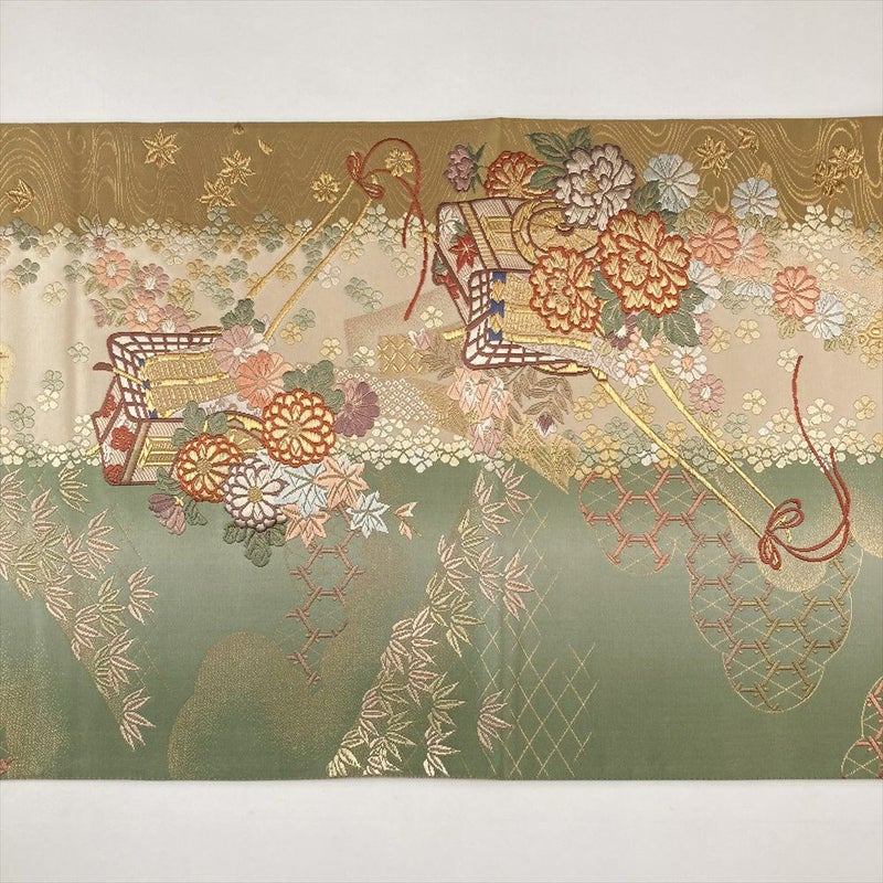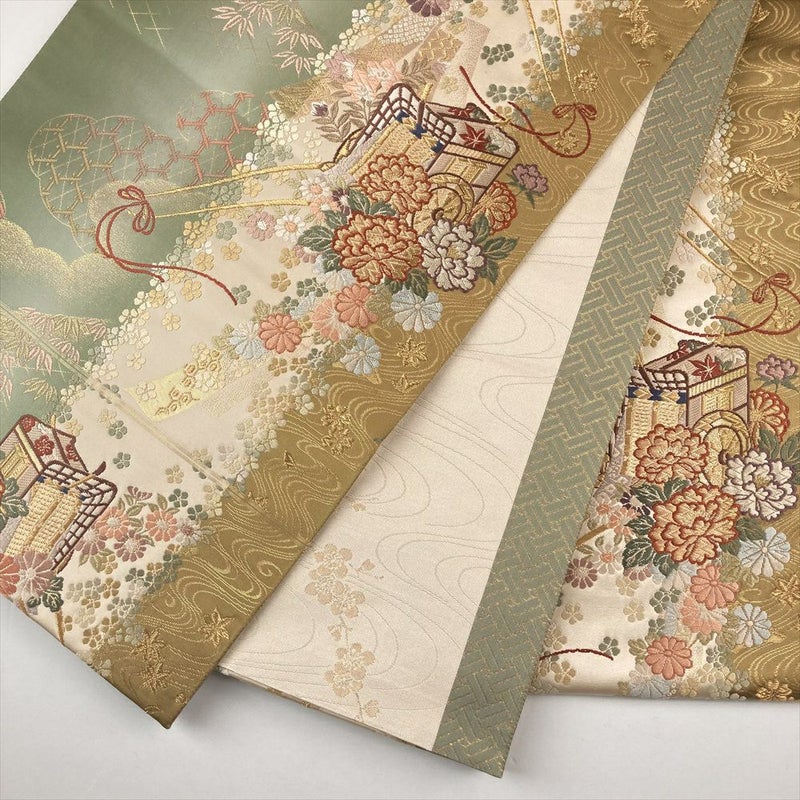 (中古)袋帯 緑 フォーマル 六通柄 金糸 四季の草花 御所車 短冊 雲取り