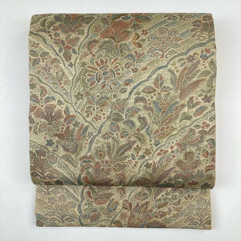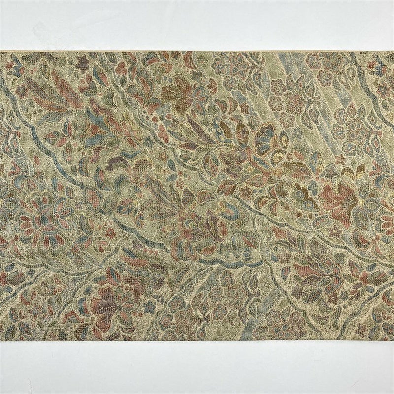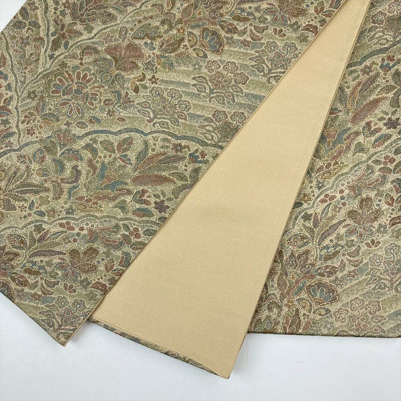 (中古)袋帯 緑 セミフォーマル カジュアル 六通 金糸 変わり斜め取り 花 天平文様 オリエンタル
