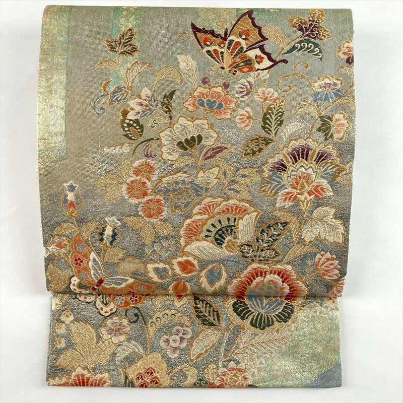 (中古)袋帯 金緑 セミフォーマル フォーマル 六通 織り 花蝶文 絹