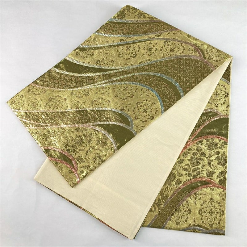 (中古)袋帯 金 セミフォーマル フォーマル 六通 織り 波 天平文 絹