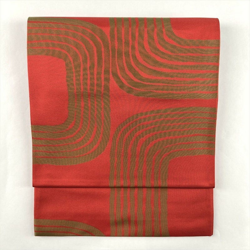 (中古)京袋帯 赤 カジュアル セミフォーマル 全通 織り モダン 抽象柄 絹