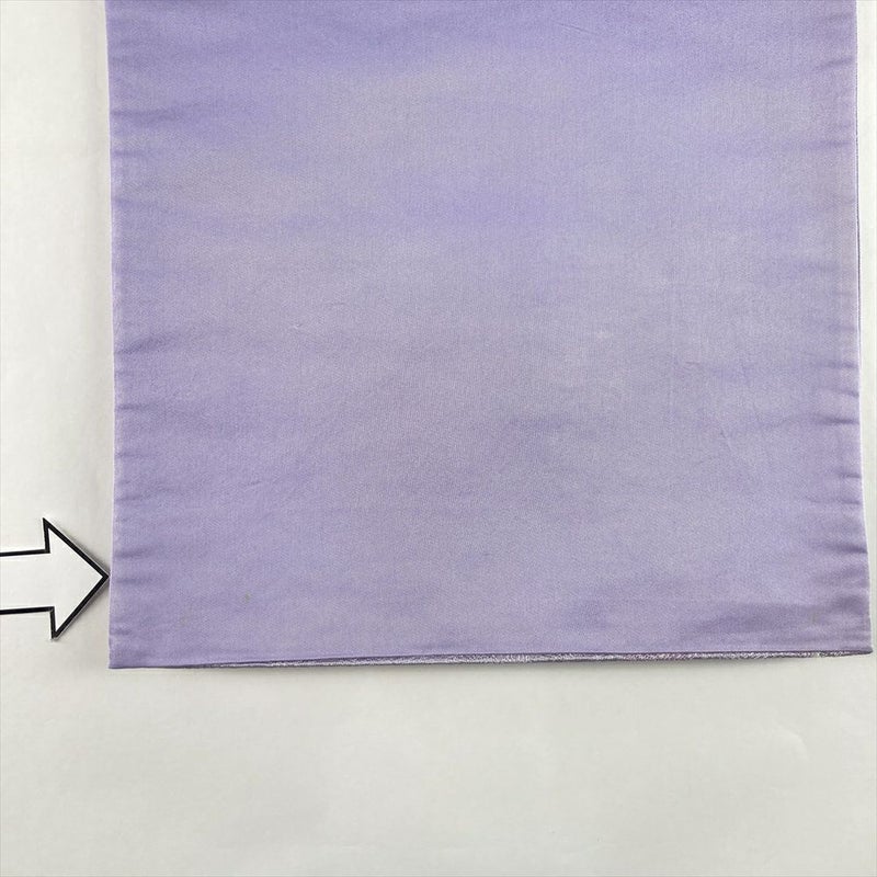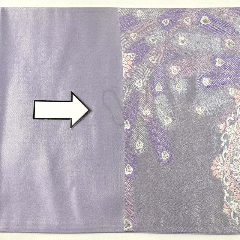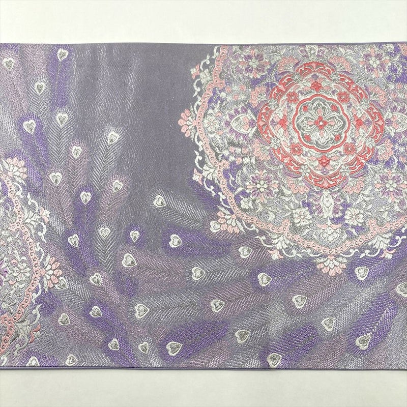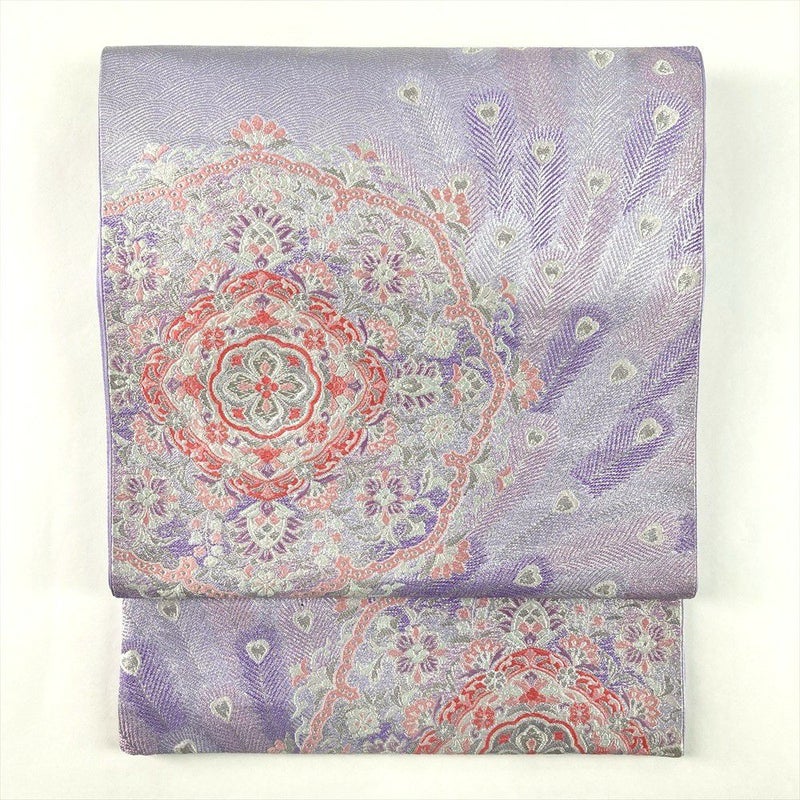 (中古)京袋帯 薄紫 銀 カジュアル セミフォーマル 六通 織り 華文 孔雀の羽根 絹