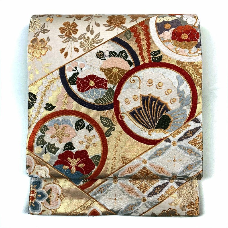 (中古)袋帯 白 フォーマル 六通 金糸銀糸 丸紋 四季花 宝華紋