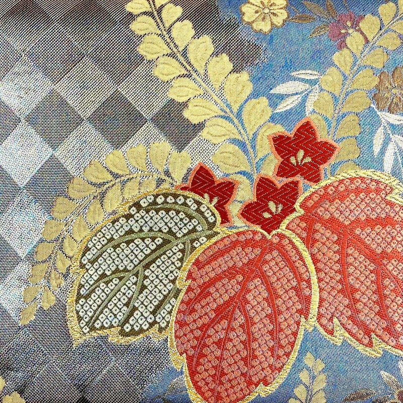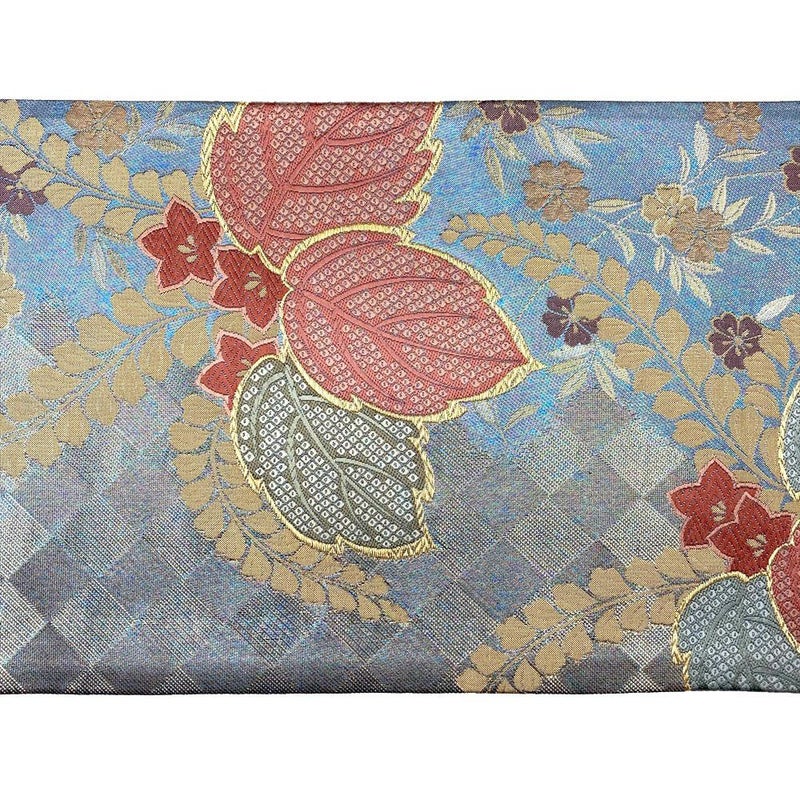 金や多色使いの糸で華やかな雰囲気を演出します。日本の伝統的な文様をモダンにアレンジした帯です。こちらは目立つ汚れもなくリユース品としては非常に状態の良いお品となっております。