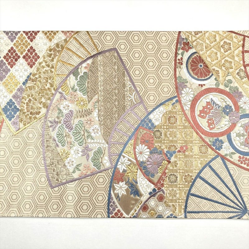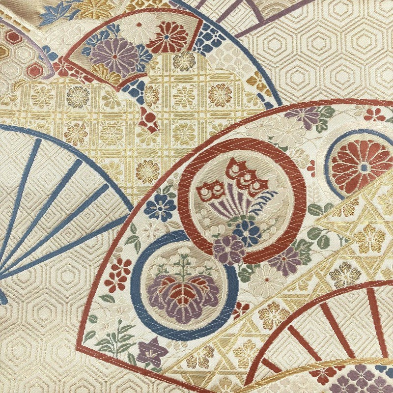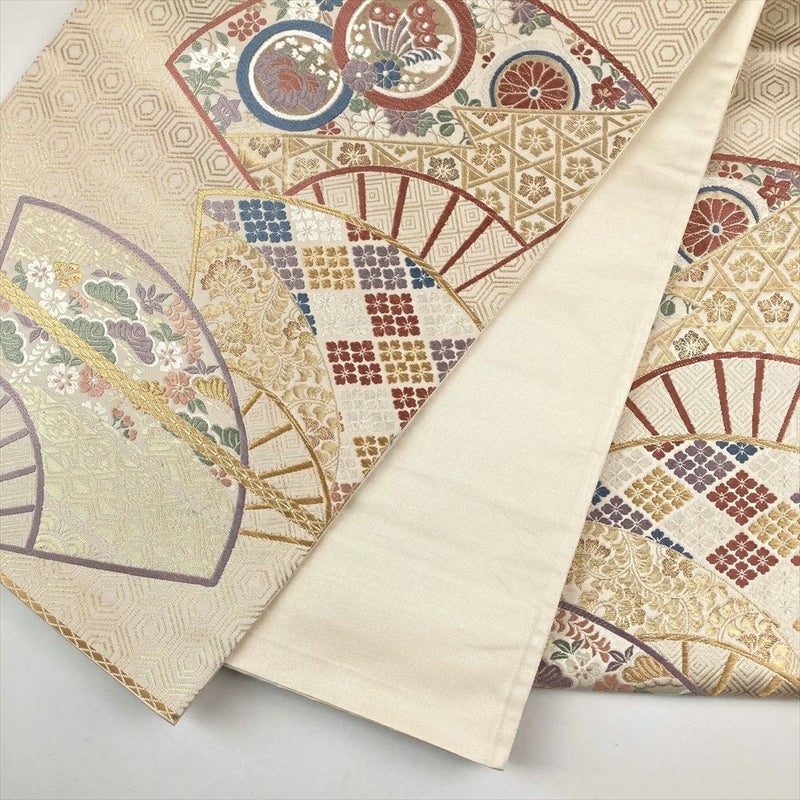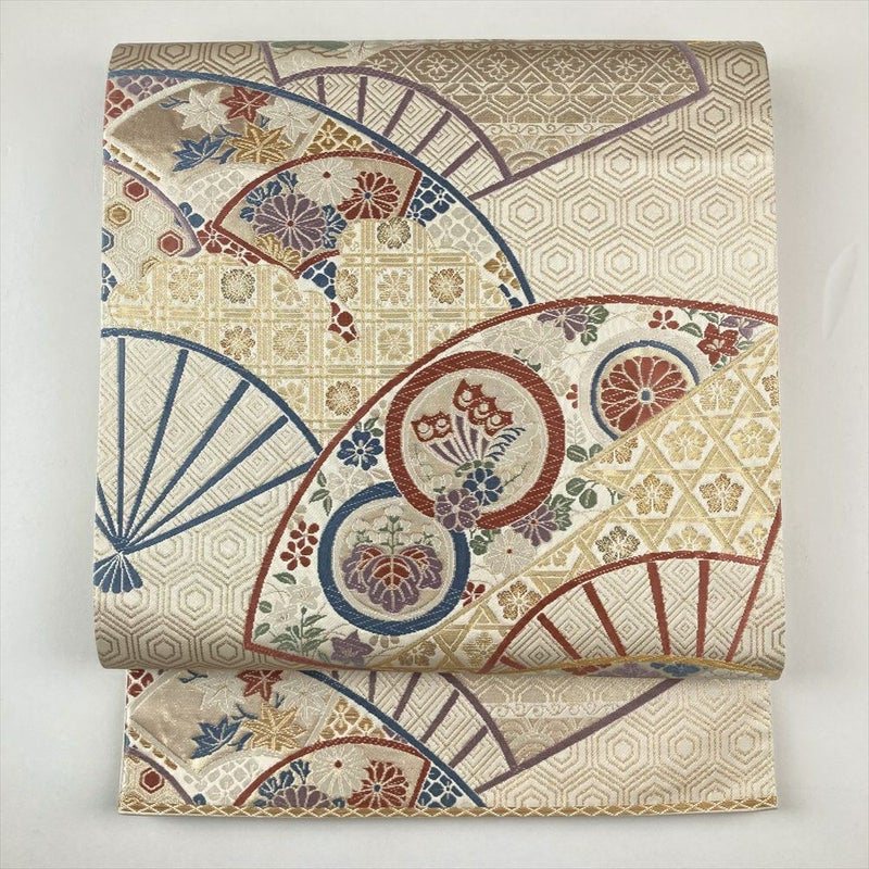 (中古)袋帯 生成 フォーマル 六通柄 金糸 四季の草花 扇子 吉祥文様