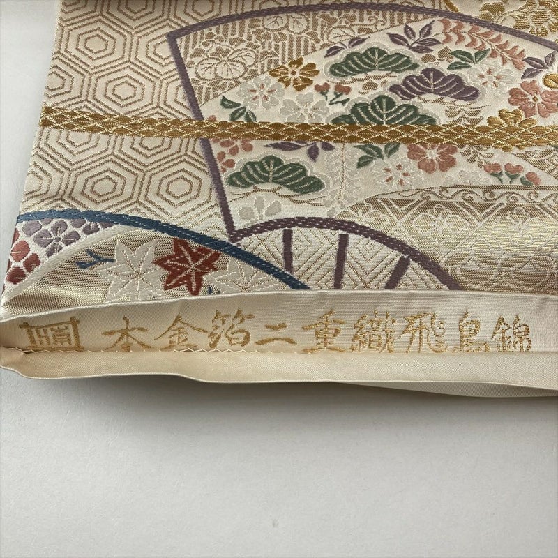 若干の使用感はありますが、良い状態のお品となっております。ベージュ地に優しげな色糸の控えめな印象の帯です。着る人のイメージを選ばない、万能な帯です。たれ先に落款と本金箔二重織り飛鳥錦の縫い取りあり。手先から胴前に締めジワがあります。