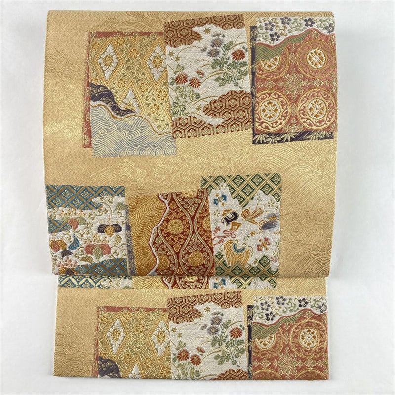 (中古)袋帯 金 セミフォーマル フォーマル 六通 織り 色紙 四季花 吉祥文 絹