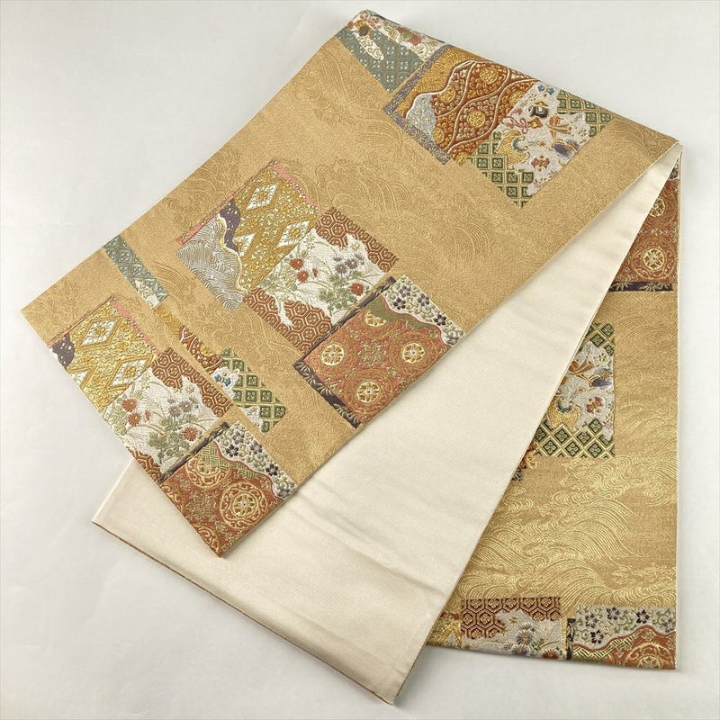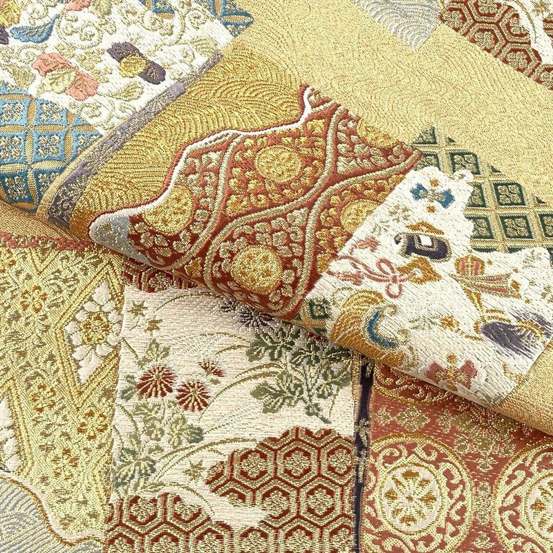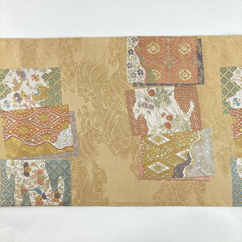 金地に色紙文様を配し、四季の花と吉祥文を織り込んだ袋帯。