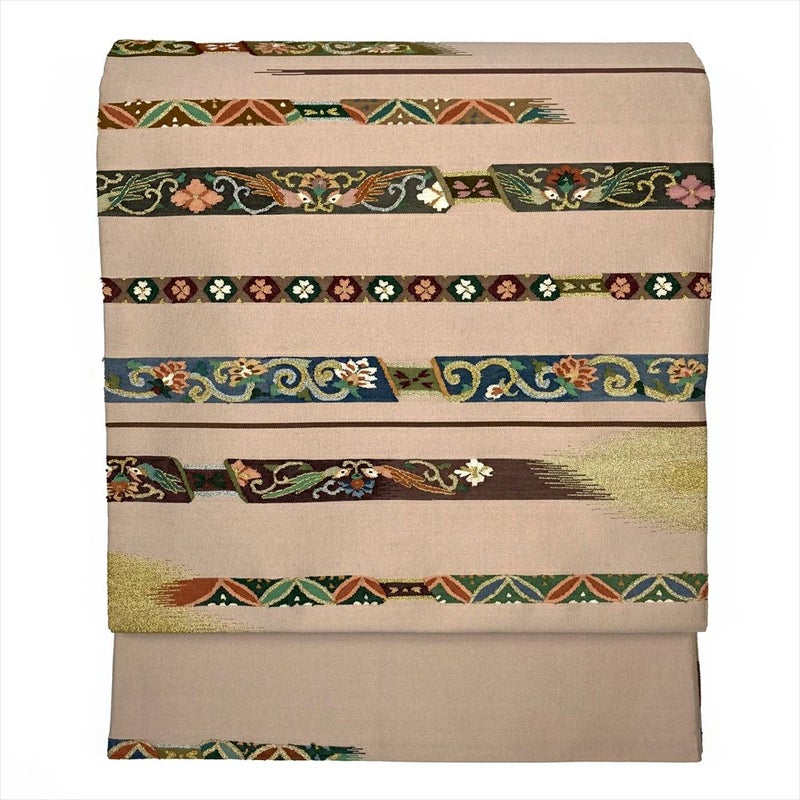 (中古)袋帯 生成り セミフォーマル 六通柄 金糸 銀糸 横段 明綴れ 天平文様 オリエンタル