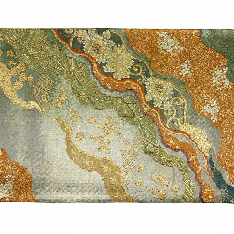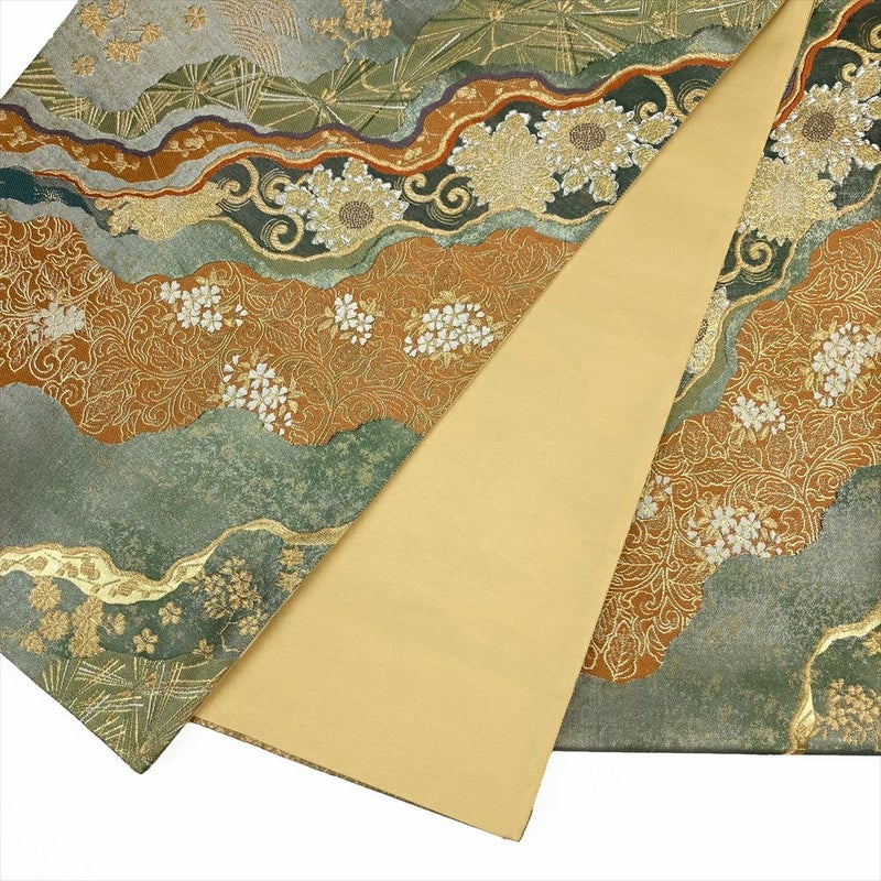 (中古)袋帯 緑 フォーマル 金糸銀糸 道長取 花唐草 古典文様