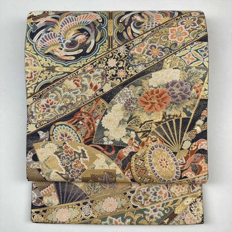 (中古)袋帯 金 フォーマル 金糸 斜め取り 格天井 鳳凰 蔓花 扇子 楽器文