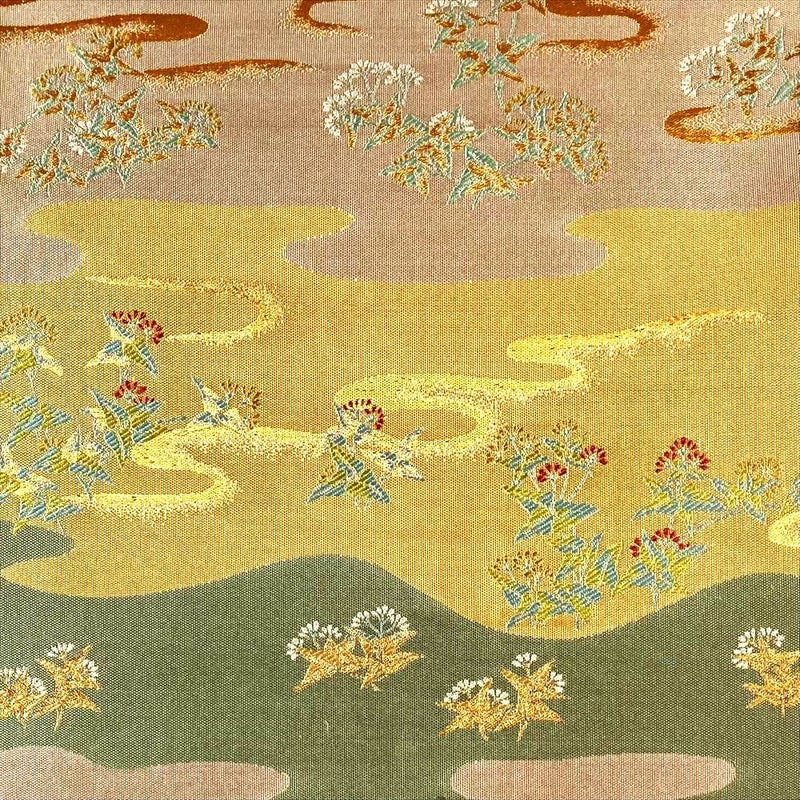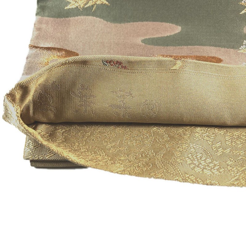 フォーマルシーン、セミフォーマルシーンでお使いいただける帯です。たれ先に萬葉染🄬茜草の縫い取りがあります。従来の草木染めよりも簡単な工程で、古代の色合いを再現できる染色技法です。手先から胴前にかけて締めシワがあります。たれ先にほつれがありますが、まだまだ十分お使いいただけるお品となっております。