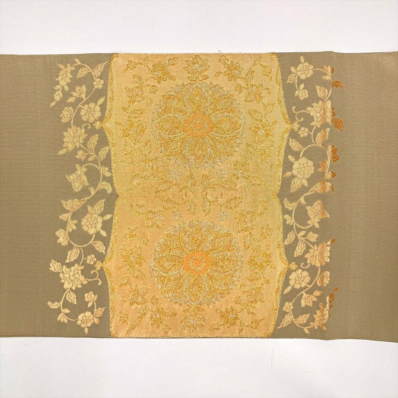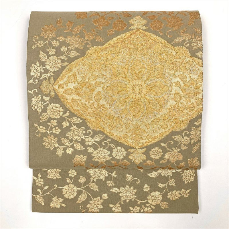 (中古)袋帯 ベージュ フォーマル セミフォーマル 六通 金糸 華文 牡丹唐草
