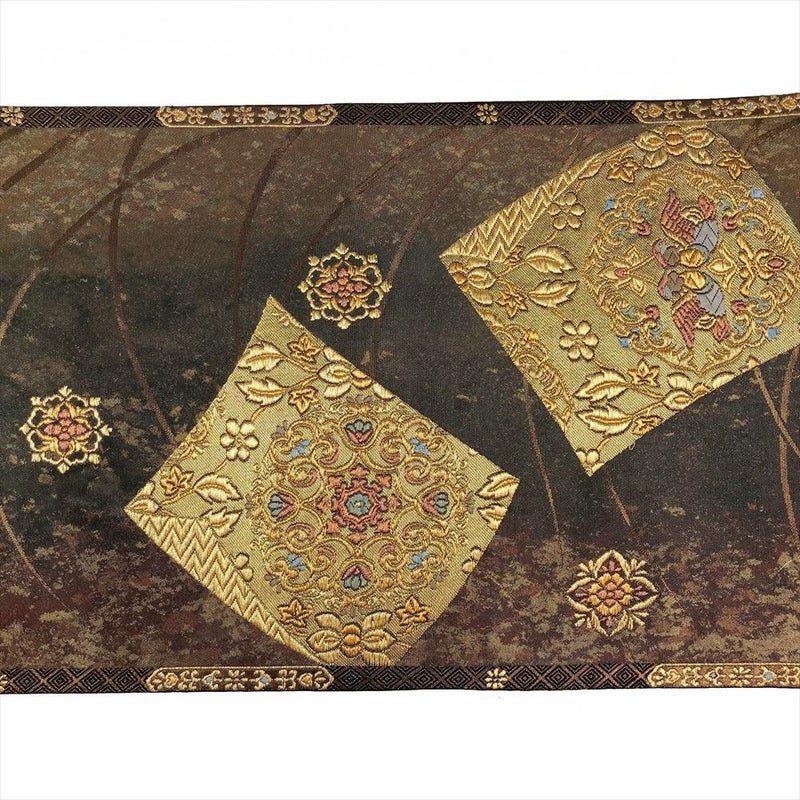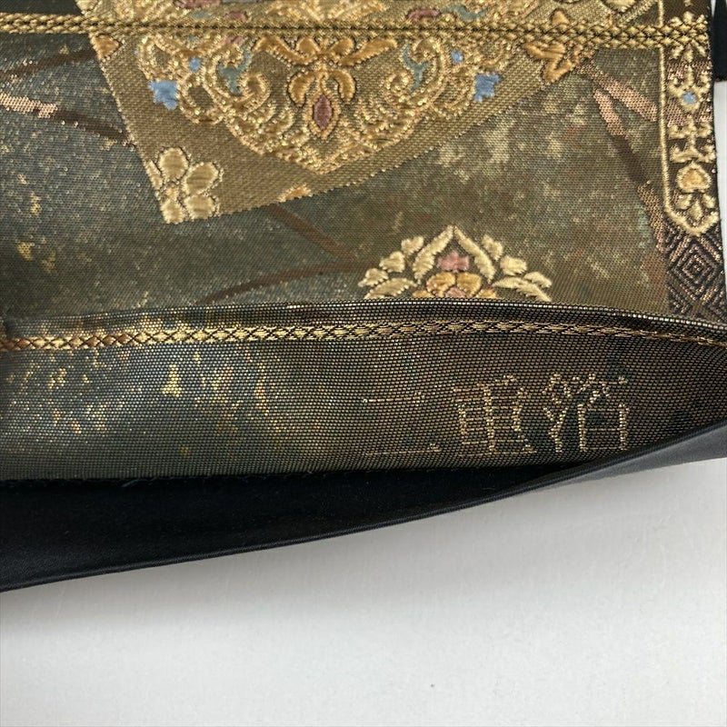(中古)袋帯 黒 セミフォーマル 六通柄 色紙 華文 露芝 本金箔青銅 二重箔