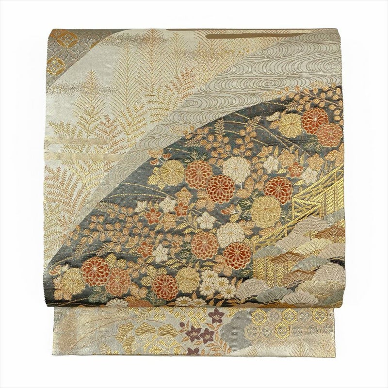 (中古)袋帯 銀 フォーマル 六通柄 山並み 菊 女郎花 竜胆 松 御簾垣