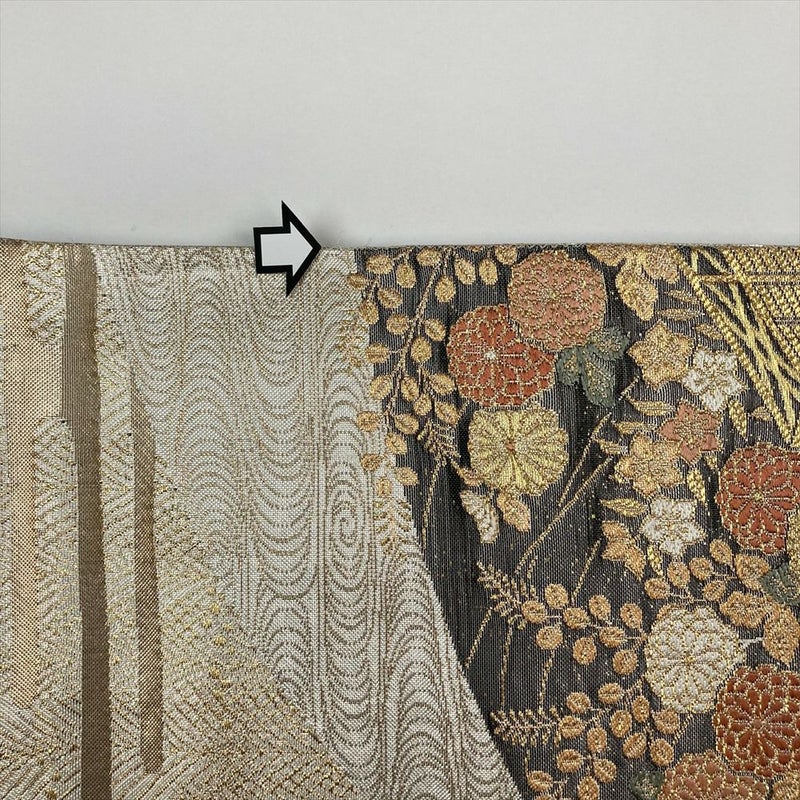 使用感はありますが、お太鼓、手先は比較的良い状態ですので、着用に問題はないと思われます。四季の草花に吉祥文様がデザインされた正統派の帯です。三越のネームがあります。裏地、無地部分、全体的に締めシワがあります。たたみシワがあります。耳かがり糸がところどころ飛び出ています。