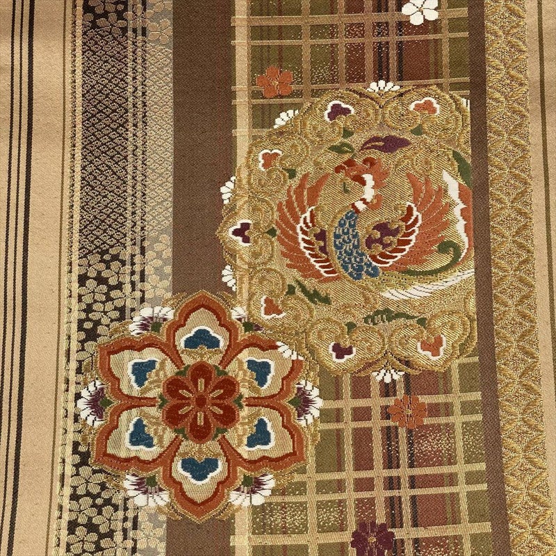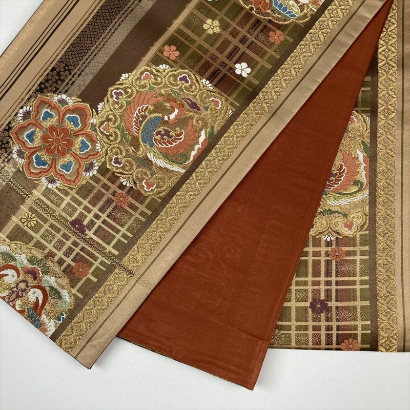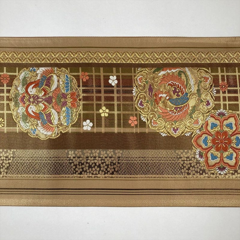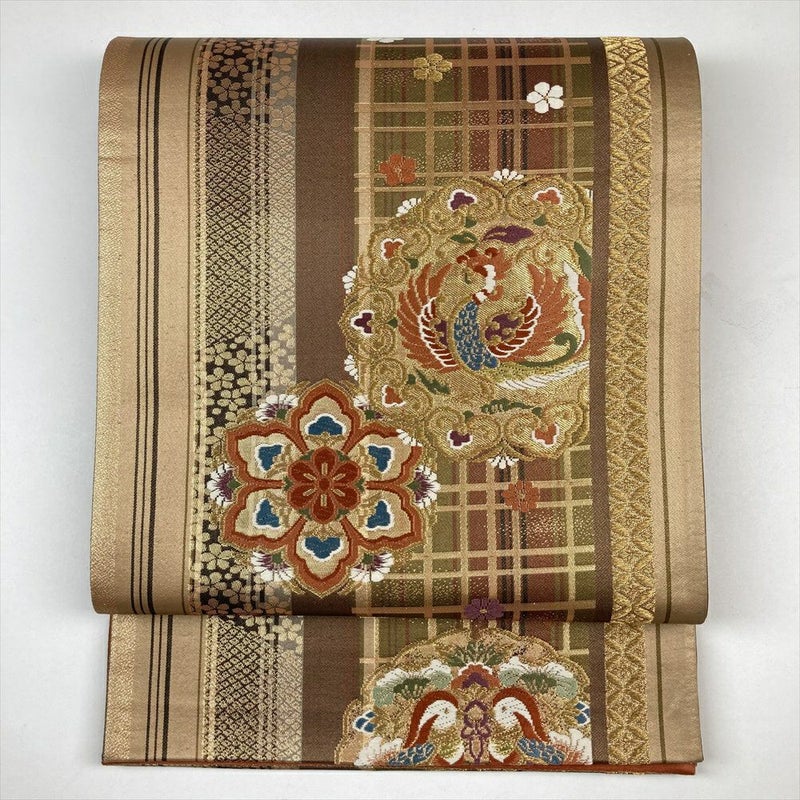 (中古)袋帯 茶 フォーマル セミフォーマル 六通柄 縦柄 金糸 華文 鳳凰文 鴛鴦文 菊 桜