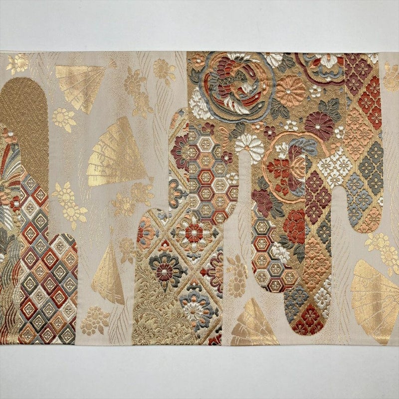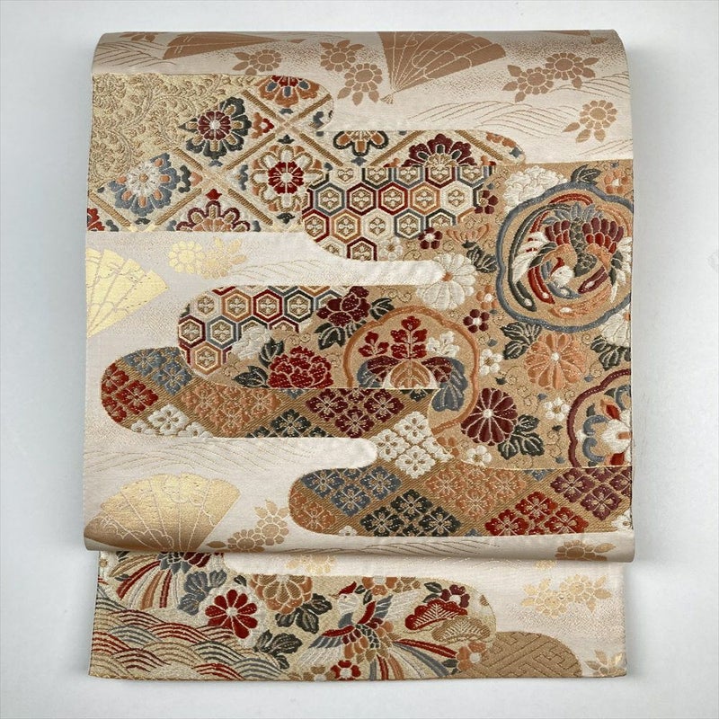金や白、多色使いの糸で華やかな雰囲気を演出します。縁起のよい伝統的な文様が織り出されています。目立つ汚れはないのですが若干の使用感があります。リユース品としては良い状態のお品となっております。無地部分に汚れがあります。