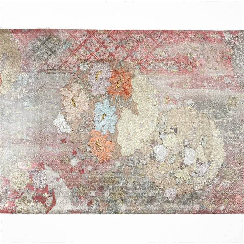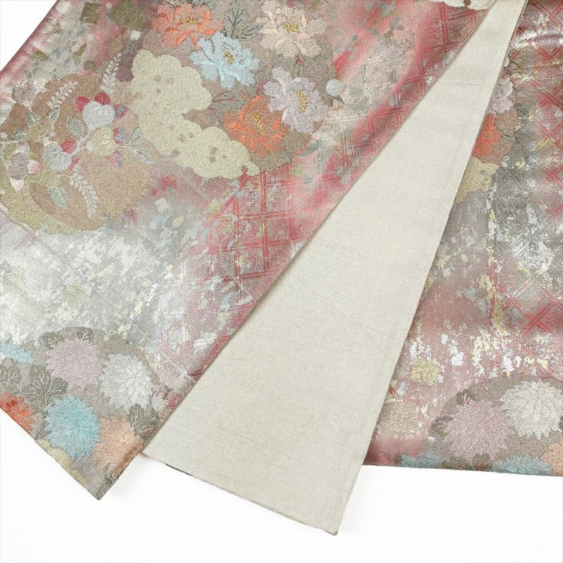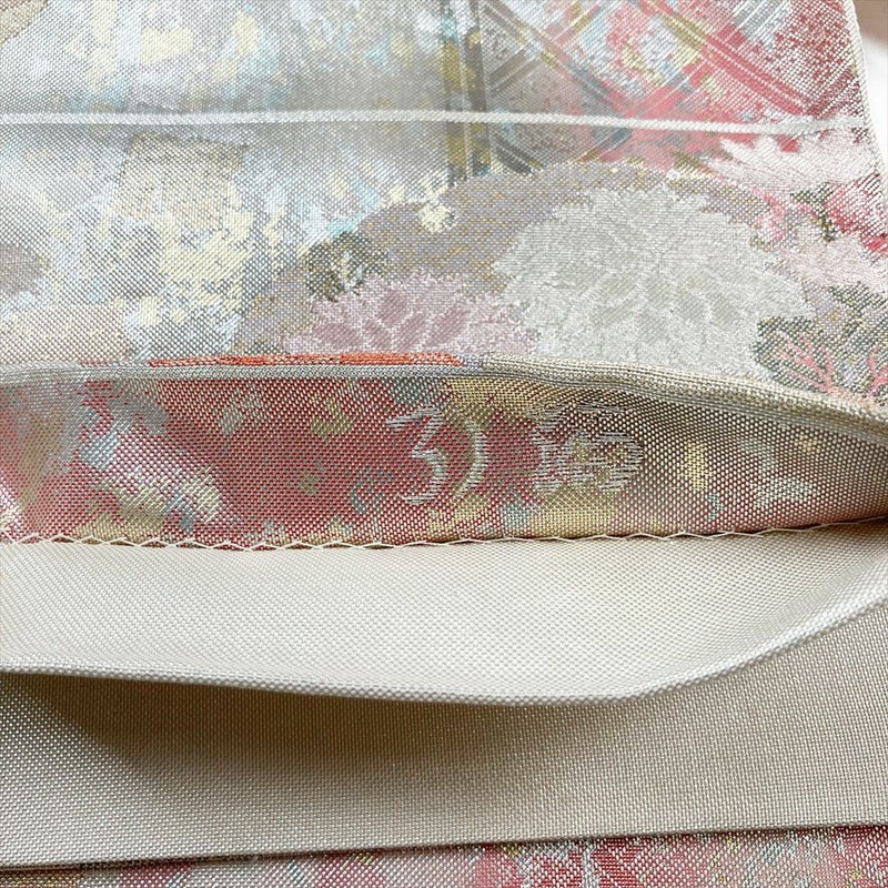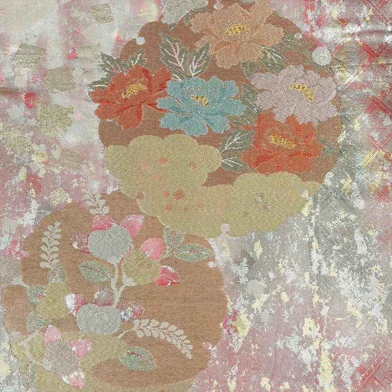 (中古)袋帯 ピンク フォーマル 六通柄 佐賀錦 引箔 金糸 銀糸 切り箔 雪輪 牡丹 椿 菊 梅