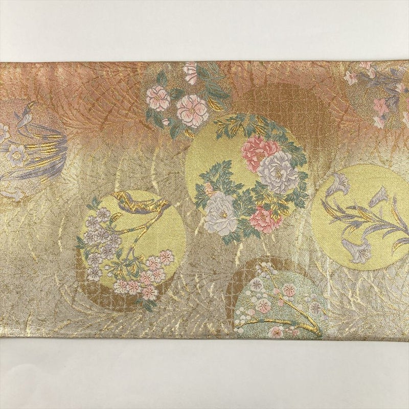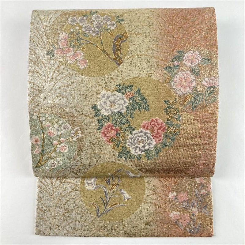 白金の引き箔に春秋の彩花と丸文をあしらった袋帯。