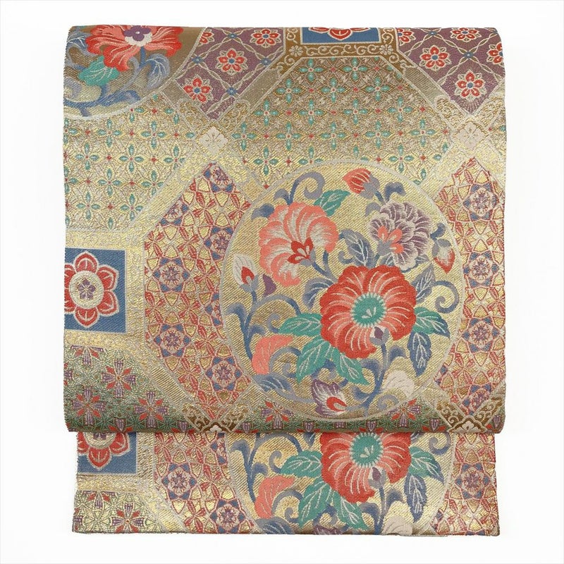 エキゾチックな文様が、金銀や白、多色使いの糸で華やかで可愛らしい雰囲気に仕上がっています。こちらの帯は目立つ汚れもなくリユース品としては非常に状態の良いお品となっております。