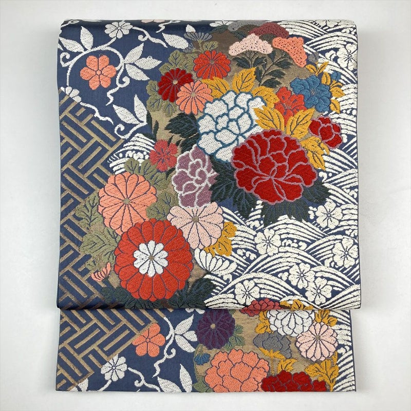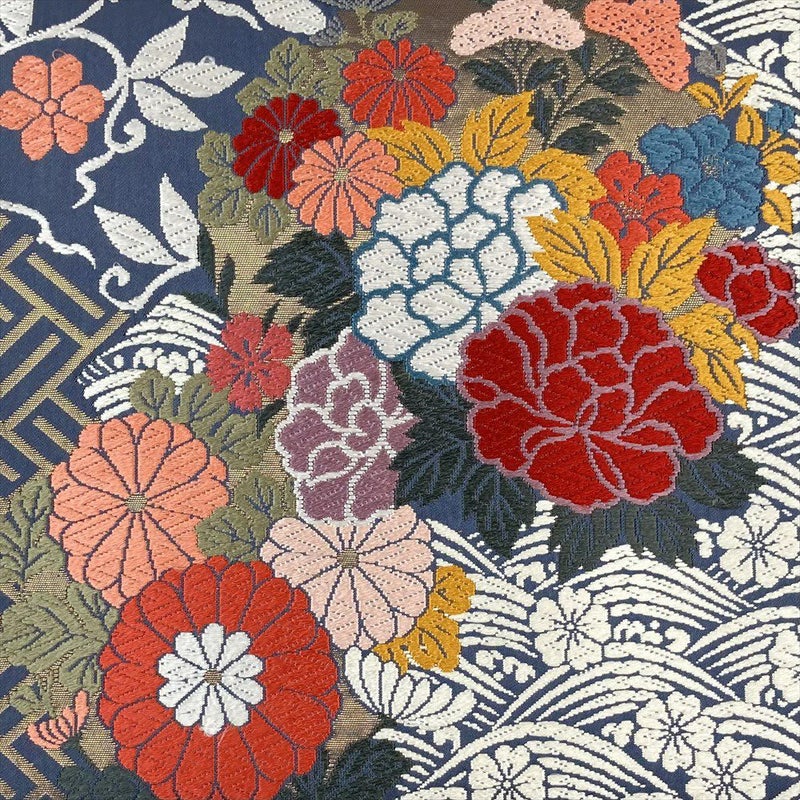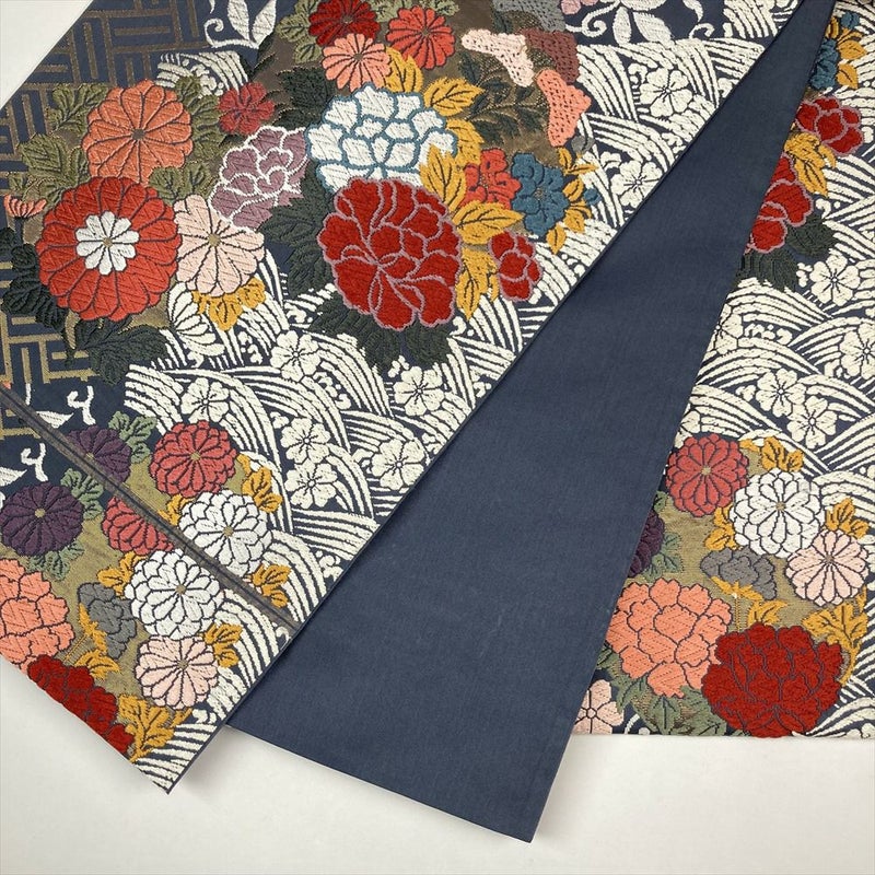 金糸や銀糸、色糸を使い、草花や紋様などの柄を刺繍のように織り出す浮織の技法を用いて織られた最高級とされる唐織りの帯です。こちらの帯は目立つ汚れもなくリユース品としては非常に状態の良いお品となっております。